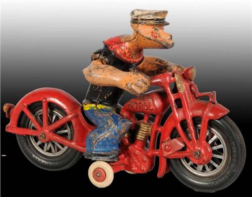 By the 1930s Hubley was the leading manufacturer of such toys in the United States. Very nice and hard to find original Hubley cast iron Popeye patrol cycle from the 1930s. The motorcycle measures about 8 inches long from tip to tip and stands 45 inches tall at its top.